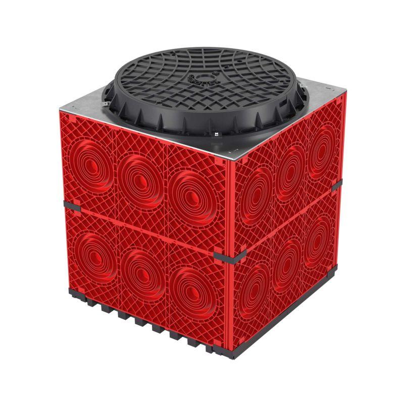 | Преимущества: | Малый вес – нет необходимости в спецтехнике|Быстрая сборка – благодаря модульной конструкции|Совместимость с системой двустенных труб|Компактность – возможность работать в стесненных условиях города|Отведение грунтовых вод за счет дренажного дна: |