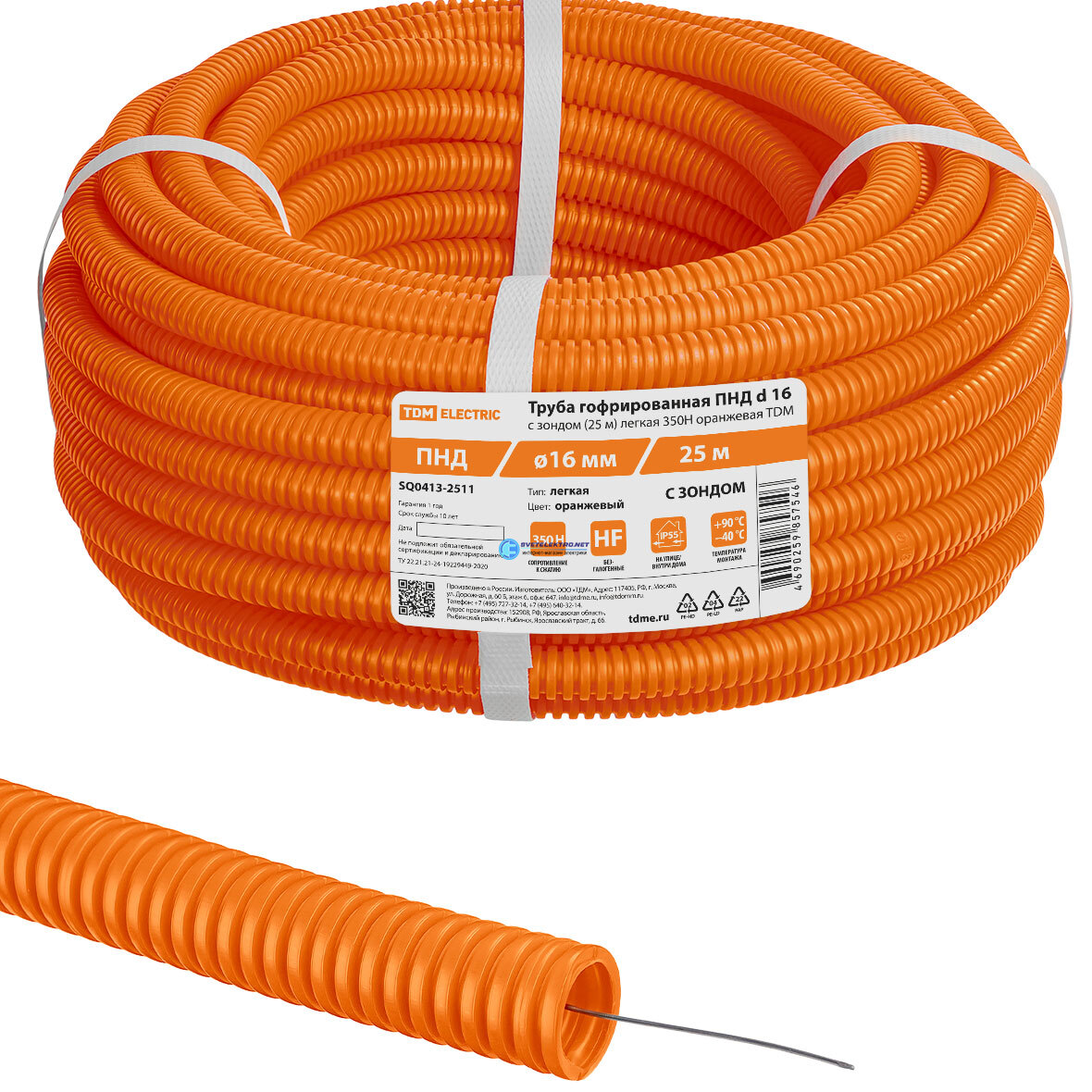 Труба гофрированная ПНД 16 с зондом м легкая 350Н оранжевая, код SQ0413-2511, производитель TDM