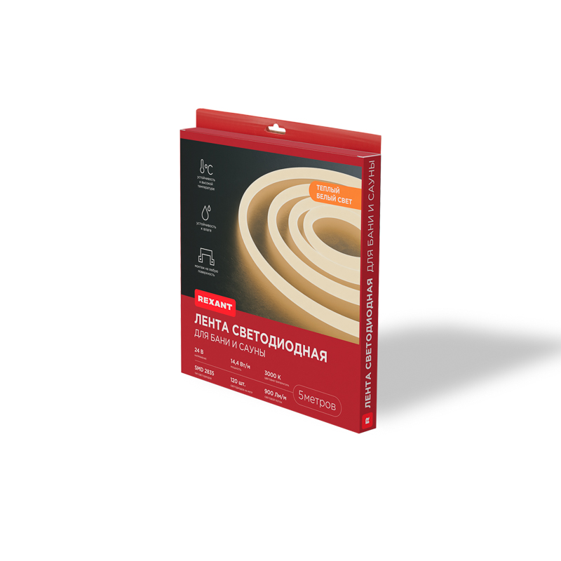 Лента светодиодная для бани и сауны 24В, SMD2835, 14,4Вт/м, 120 LED/м, 3000K, 16мм, 5м, IP68, код 141-641, производитель REXANT