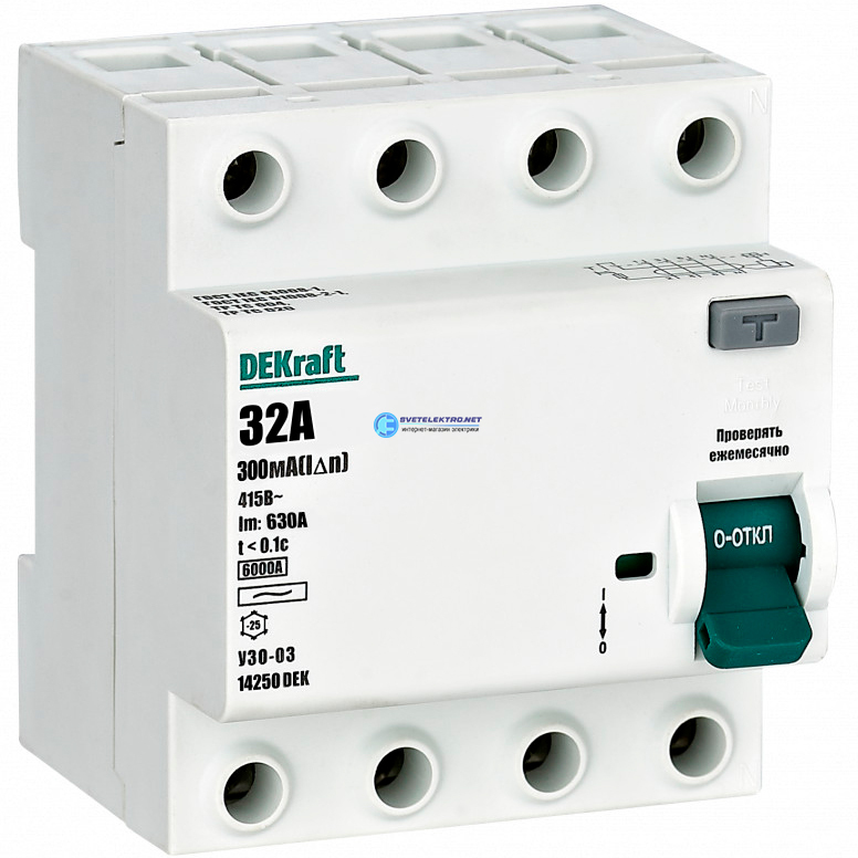 Выключатель дифференциального тока УЗО 03-6кА-4P-032А-300-AC, код 14250DEK, производитель DEKraft