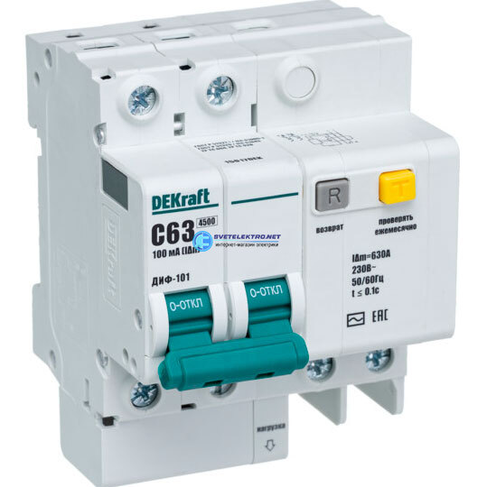 Выключатель автоматический дифференциальный АВДТ 2п 60А 100мА тип AC ДИФ-101 4.5кА, код 15017DEK, производитель DEKraft