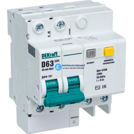 Выключатель автоматический дифференциальный АВДТ встроенная защита от сверхтоков 2Р 63А 30мА AC ДИФ-101, код 15092DEK, производитель DEKraft