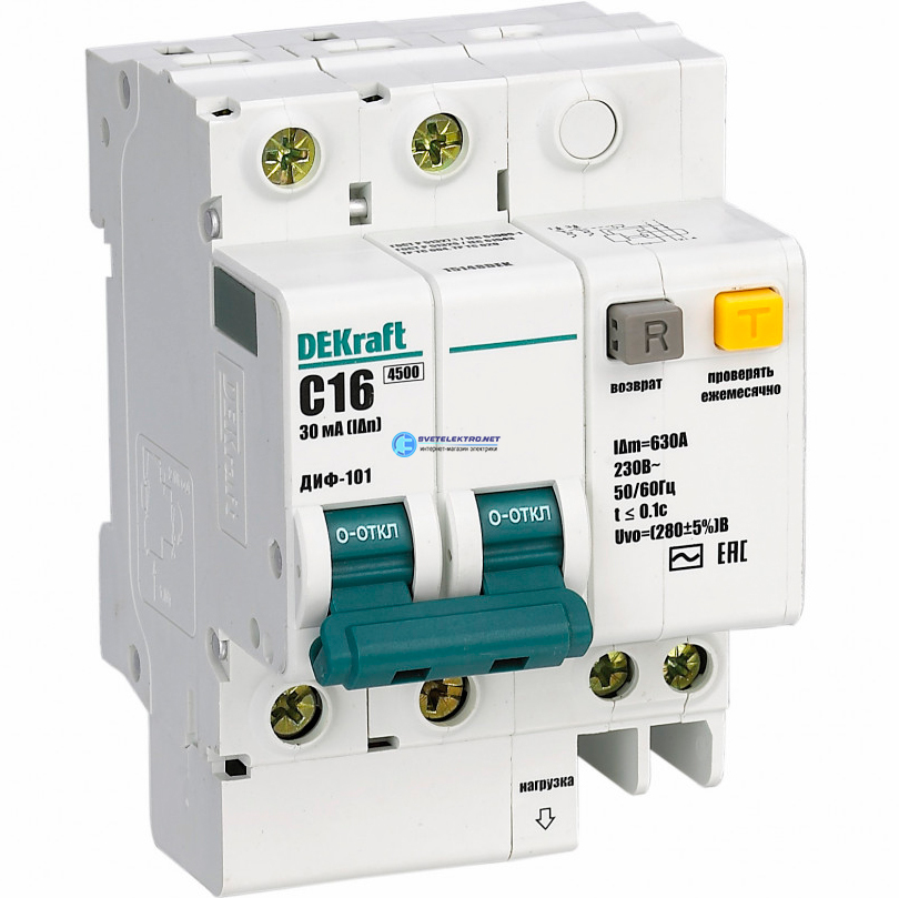 Выключатель автоматический дифференциальный АВДТ встроенная защита от сверхтоков 2P 25A 30мА AC C + OV ДИФ-101, код 15150DEK, производитель DEKraft
