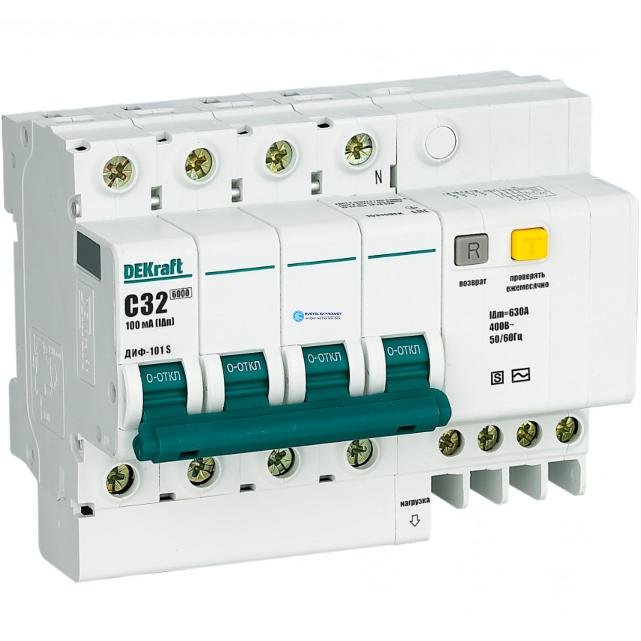 Выключатель автоматический дифференциальный АВДТ со встроенной защитой от сверхтоков 4P 32A 100мА селективный ДИФ-101 S, код 15311DEK, производитель DEKraft