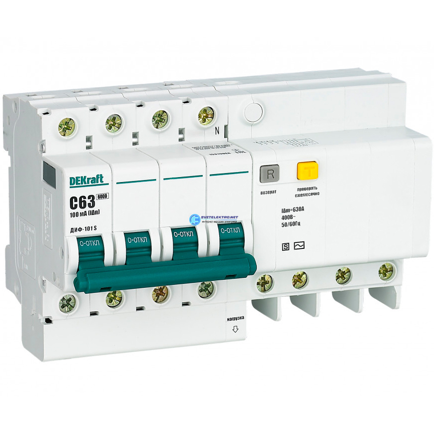 Выключатель автоматический дифференциальный АВДТ со встроенной защитой от сверхтоков 4P 63A 100мА селективный ДИФ-101 S, код 15314DEK, производитель DEKraft