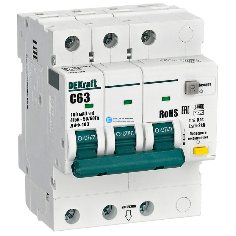 Выключатель автоматический дифференциальный 3P 63А 100мА AC х-ка C ДИФ-103 6кА, код 16389DEK, производитель DEKraft