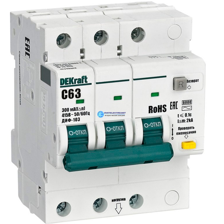 Выключатель автоматический дифференциальный 3P 63А 300мА AC х-ка C ДИФ-103 6кА, код 16398DEK, производитель DEKraft