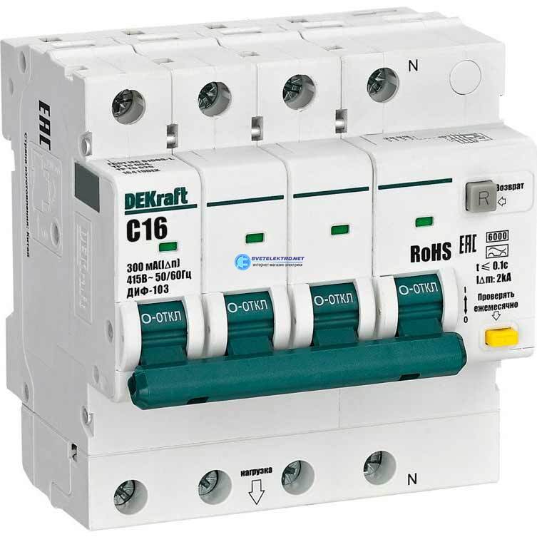 Выключатель автоматический дифференциальный 3P+N 16А 300мА AC х-ка C ДИФ-103 6кА, код 16419DEK, производитель DEKraft