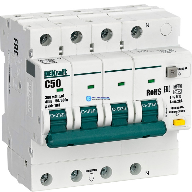 Выключатель автоматический дифференциальный 3P+N 50А 300мА AC х-ка C ДИФ-103 6кА, код 16424DEK, производитель DEKraft