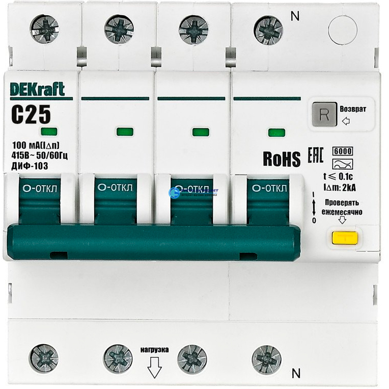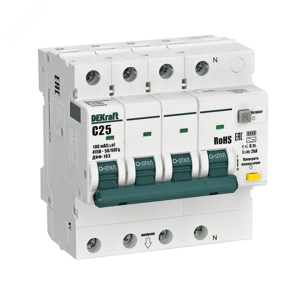 Выключатель автоматический дифференциальный 3P+N 25А 100мА х-ка C ДИФ-103 6кА, код 16439DEK, производитель DEKraft