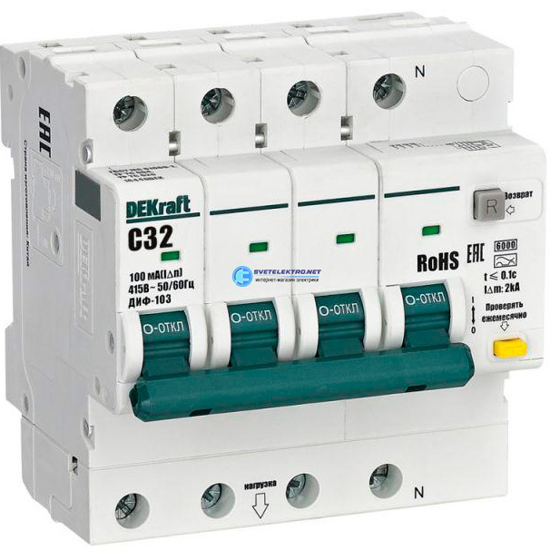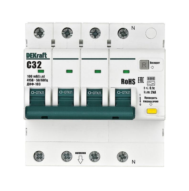 Выключатель автоматический дифференциальный 3P+N 32А 100мА х-ка C ДИФ-103 6кА, код 16440DEK, производитель DEKraft