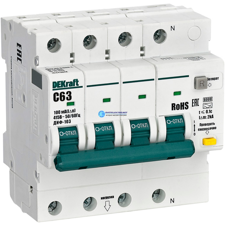 Выключатель автоматический дифференциальный 3P+N 63А 100мА х-ка C ДИФ-103 6кА, код 16443DEK, производитель DEKraft