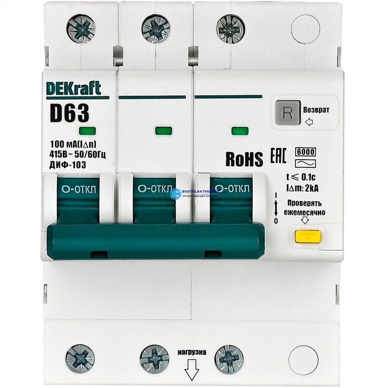 Выключатель автоматический дифференциальный 3P 63А 100мА AC х-ка ДИФ-103 6кА, код 16497DEK, производитель DEKraft