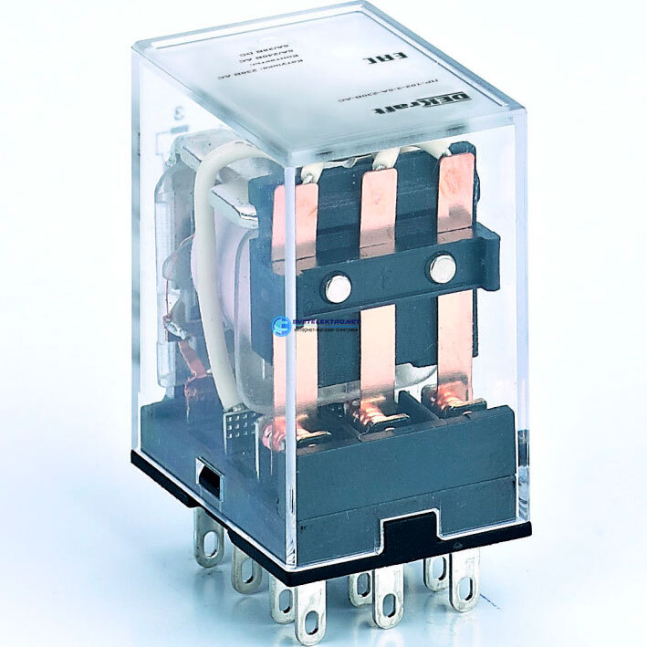 | Преимущества: | Новое исполнение с кнопкой ''ТЕСТ'' позволяет изменить статус контактной группы (открыт или закрыт) вручную без подключения к сети.|Компактность промежуточных реле позволяет использовать в местах с ограниченным пространством для монтажа.|Высокая коммутационная износостойкость засчет использования уникальной структуры дугогасящей пластины и применения высокотехнологичных серебросодержащих электрических контактов.|Высокая скорость переключения - менее 20 мс, позволяет использовать реле в любых системах автоматизации|Номинальный ток до 10 А и три вида контактных групп значительно расширяют область применения.|Простота монтажа обеспечивается благодаря втычным контактам реле.: |