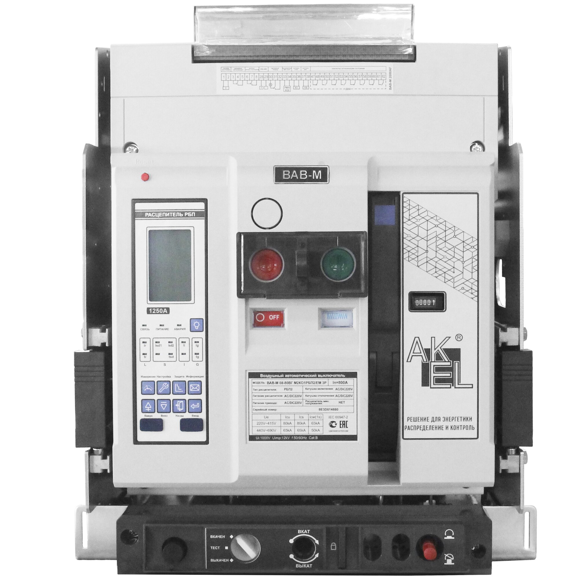 Выключатель автоматический воздушный ВАВ-М13-80ВГ М2КО1РБП2/ЕМ 3P/1250A/РБП (питание 220В AC/DC)/80 кА, код 314658, производитель АКЭЛ