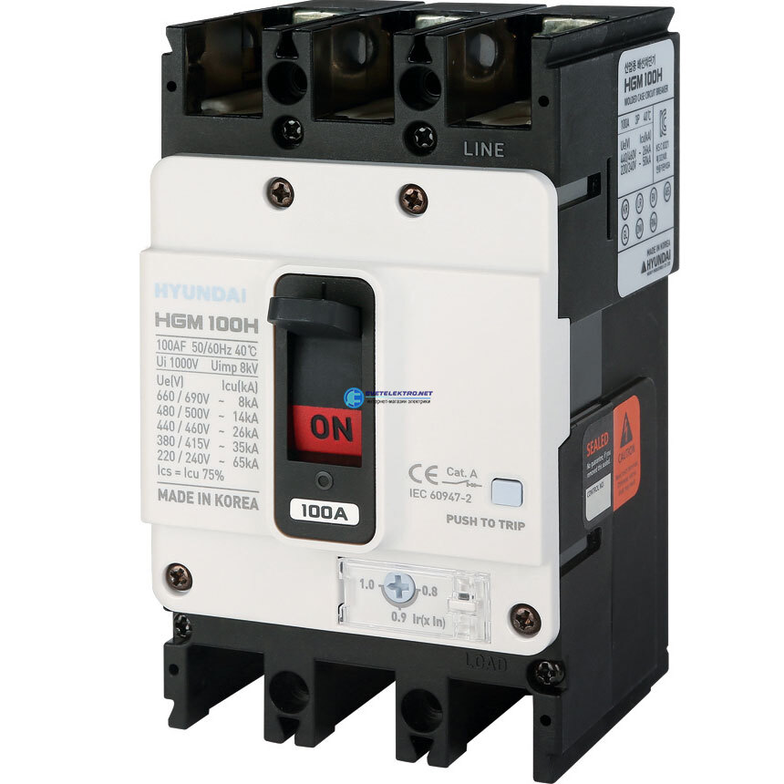 Выключатель автоматический в литом корпусе типа HGM, типоразмера 100AF, арт.HGM100HPT4S0000C00100F (100А, 26кА, полюса, регулируемый термомагнитный, код 3647629, производитель Hyundai