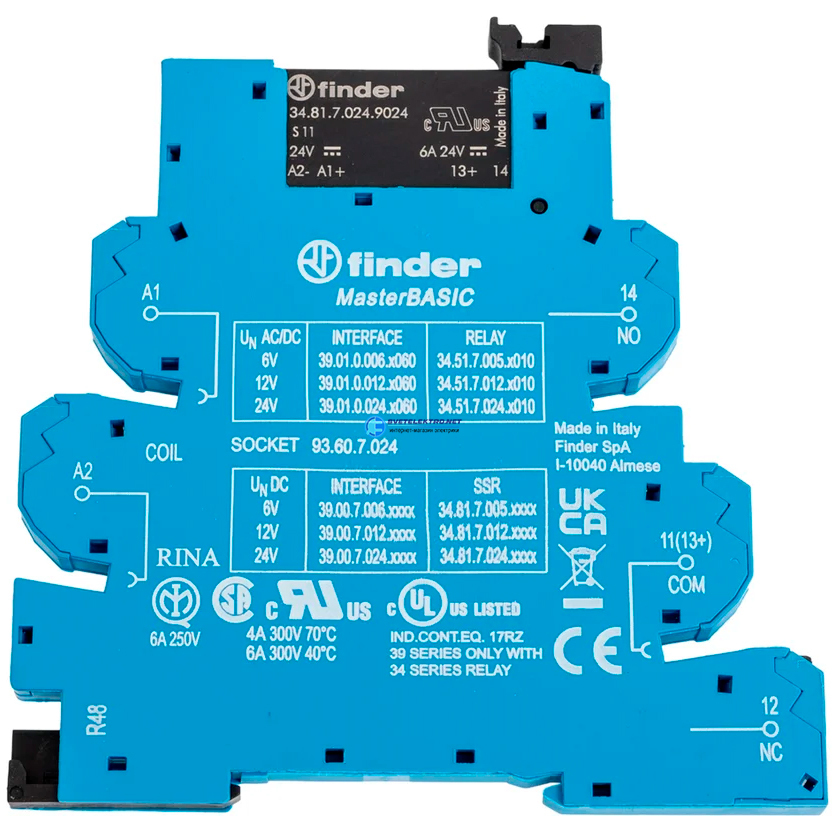 Модуль интерфейсный (сборка 34.81.7.024.9024 + 93.51.7.024), твердотельное реле, выход 6A (24В DC), питание 24В DC, категория защиты IP20, безвинтовые, код 38.91.7.024.9024, производитель FINDER