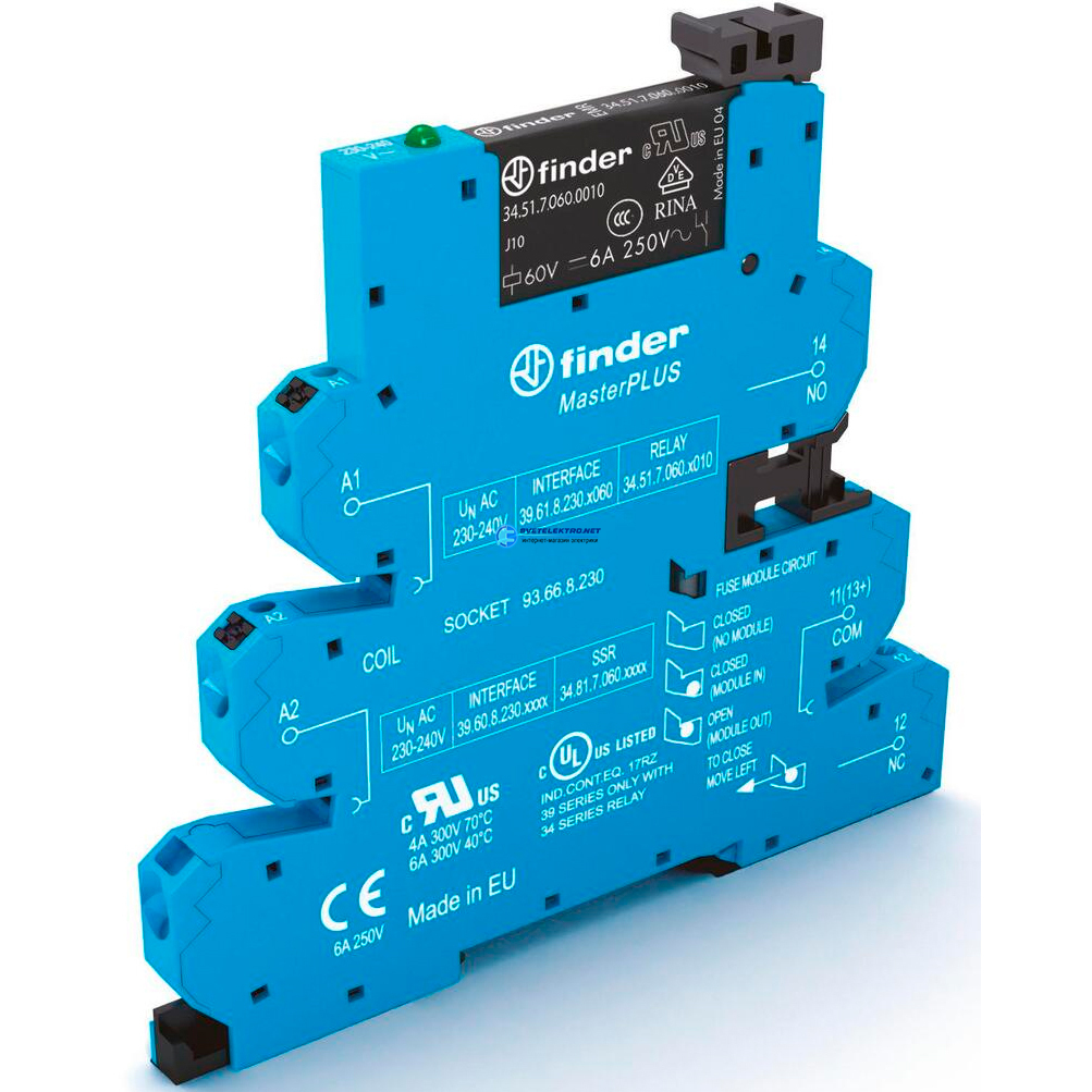 Модуль интерфейсный (сборка 34.51.7.060.0010 + 93.66.3.230), электромеханические реле, серия MasterPLUS, 1CO 6A, питание 230-240В AC/DC подавление уте, код 39.61.3.230.0060, производитель FINDER