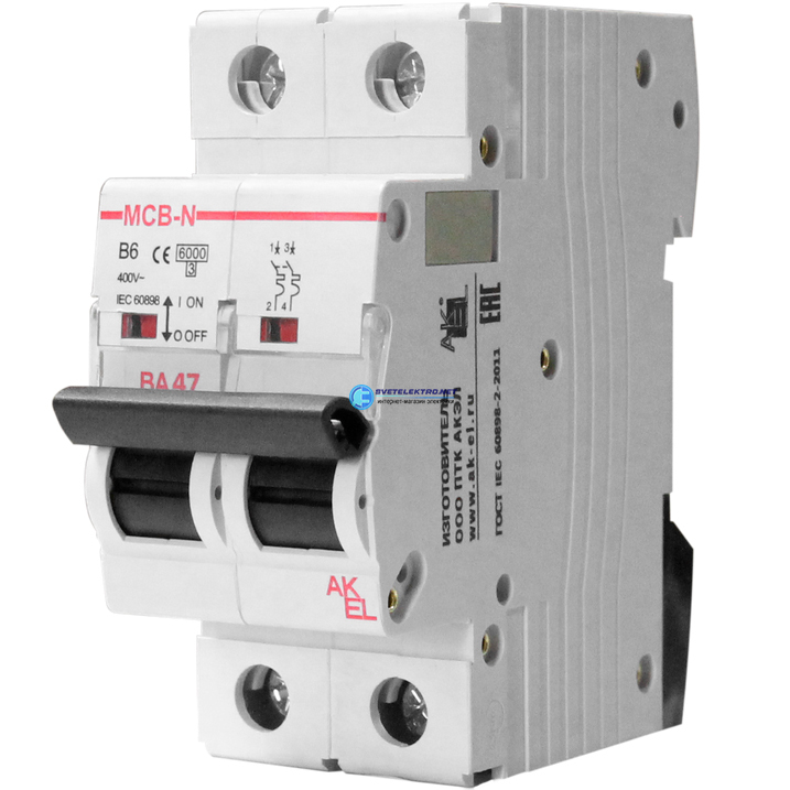 Выключатель автоматический ВА47-MCB-N-2P-B1-AC 2P/1A/B/6кА, код 400027, производитель АКЭЛ