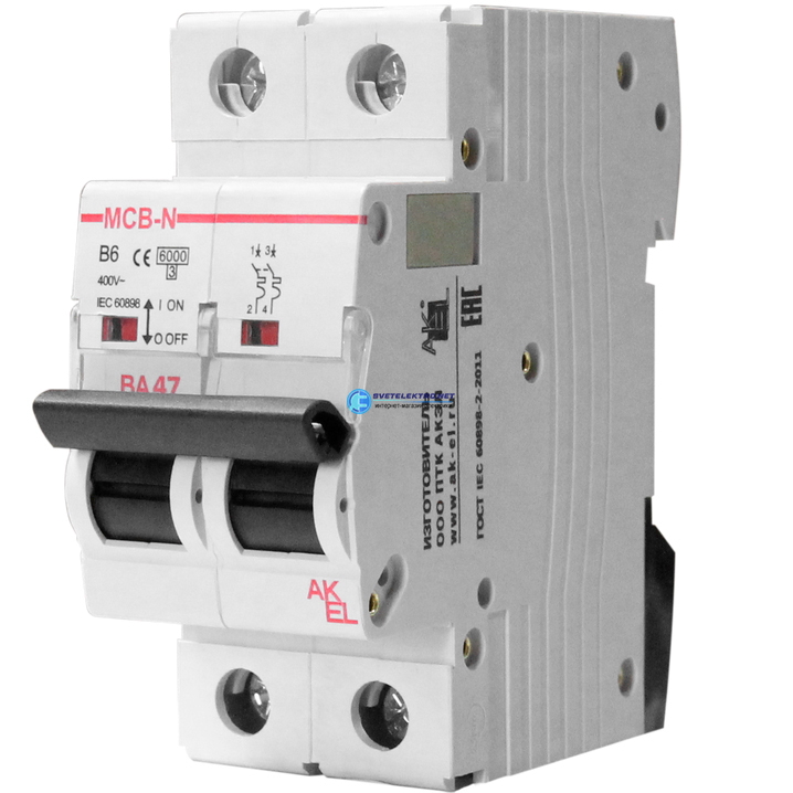 Выключатель автоматический ВА47-MCB-N-2P-B40-AC 2P/40A/B/6кА, код 400037, производитель АКЭЛ