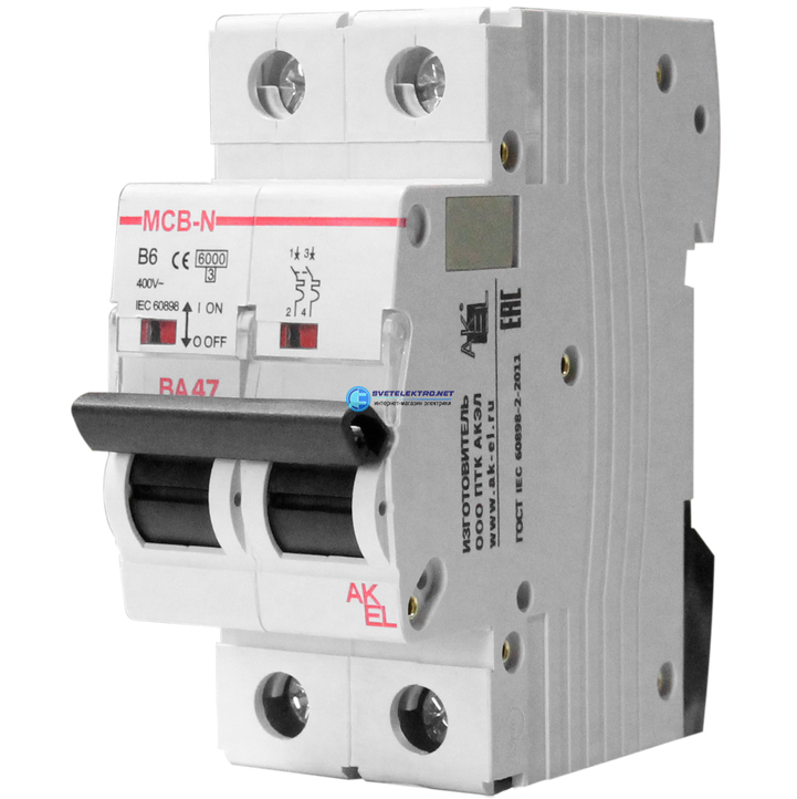 Выключатель автоматический ВА47-MCB-N-2P-B63-AC 2P/63A/B/6кА, код 400039, производитель АКЭЛ