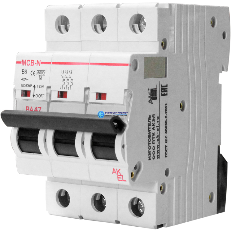 Выключатель автоматический ВА47-MCB-N-3P-B25-AC 3P/25A/B/6кА, код 400048, производитель АКЭЛ