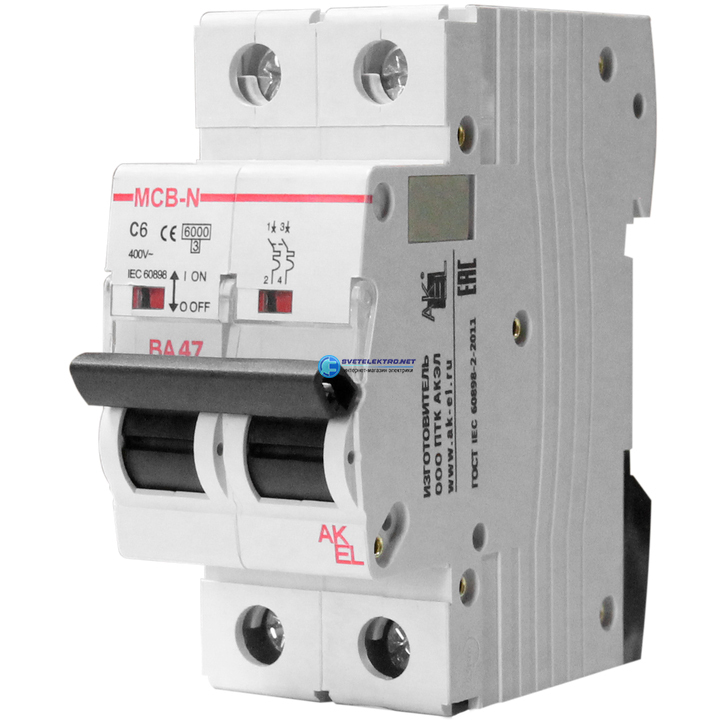 Выключатель автоматический ВА47-MCB-N-2P-C6-AC 2п 6A C 6кА, код 400109, производитель АКЭЛ