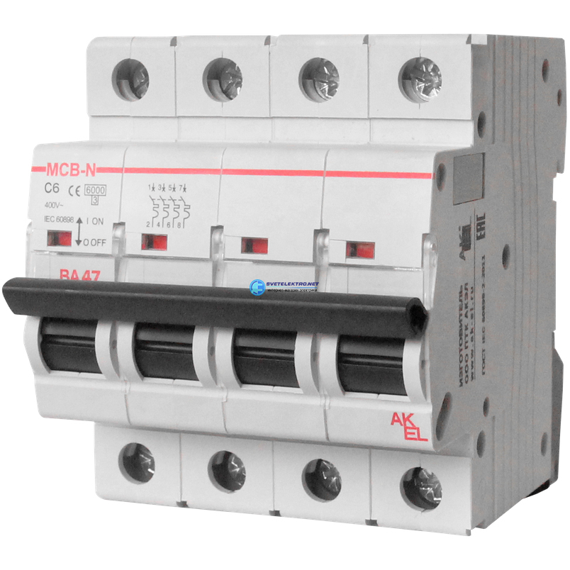 Выключатель автоматический ВА47-MCB-N-4P-C6-AC 4P/6A/C/6кА, код 400148, производитель АКЭЛ