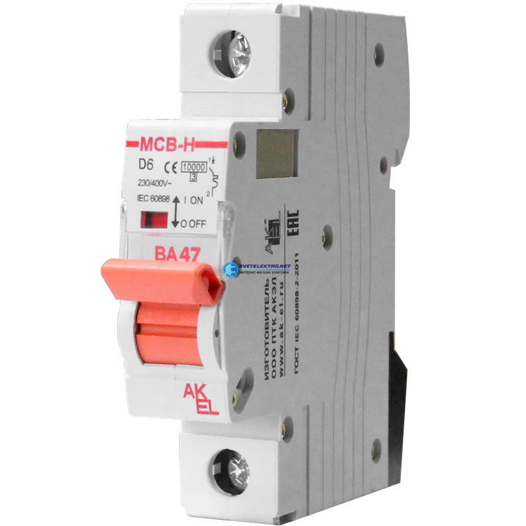 Выключатель автоматический ВА47-MCB-H-1P-D63-AC 1P/63A/D/10кА, код 400403, производитель АКЭЛ