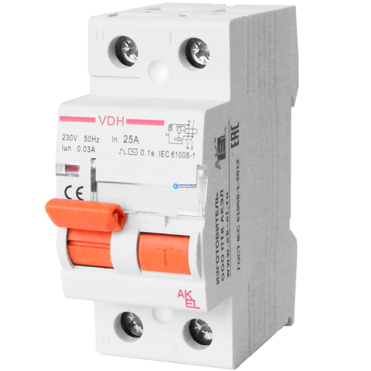 Устройство защитного отключения УЗО-VDH-2P-25A-300мА-Тип AC 2P/25A/AC/230VAC/300мА/10кА, код 400650, производитель АКЭЛ