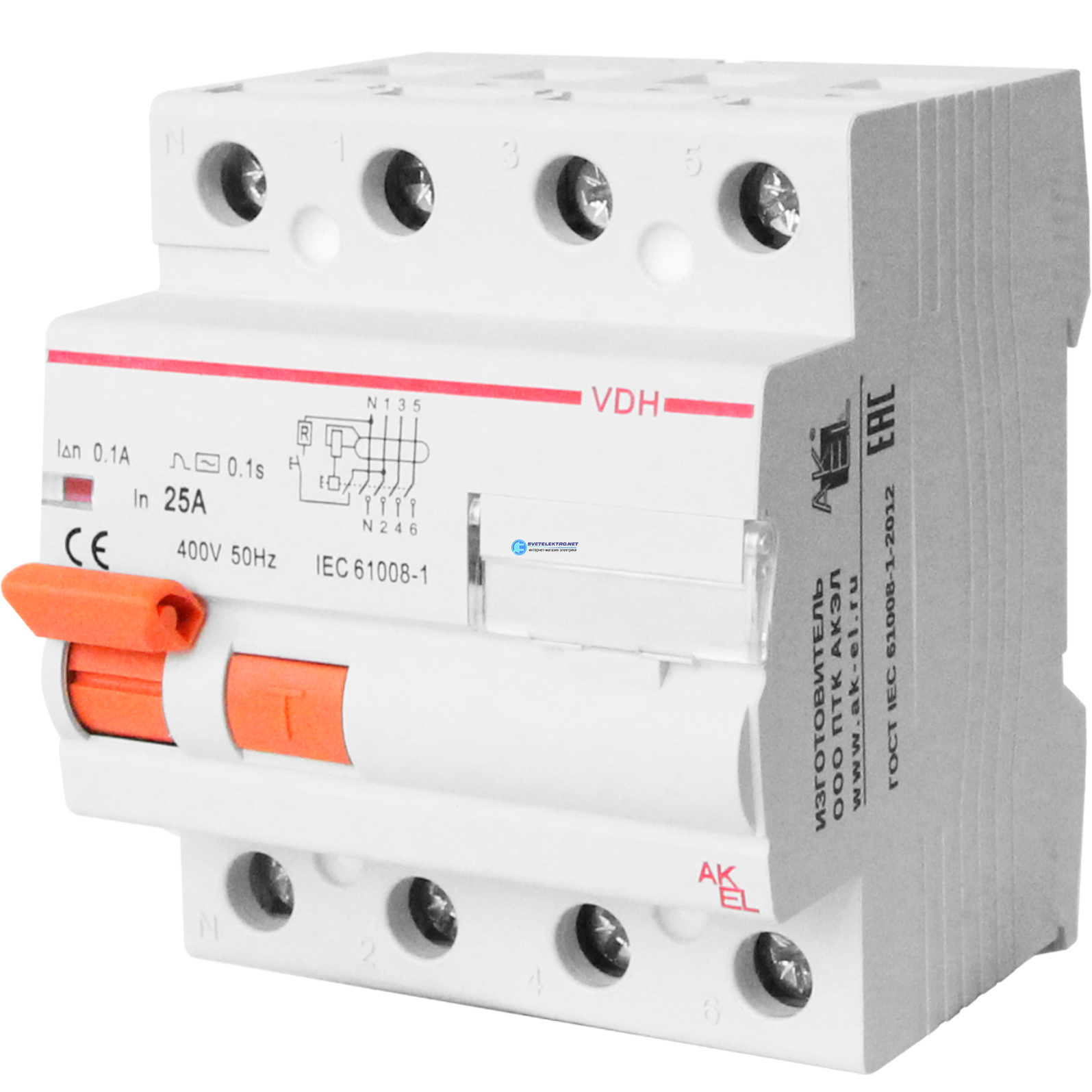 Устройство защитного отключения -VDH-4P-16A-30мА-Тип AC 4P/16A/AC/380VAC/30мА/10кА, код 400666, производитель АКЭЛ
