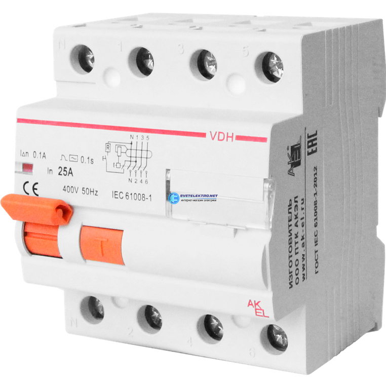 Устройство защитного отключения УЗО-VDH-4P-40A-30мА-Тип AC 4P/40A/AC/380VAC/30мА/10кА, код 400675B, производитель АКЭЛ