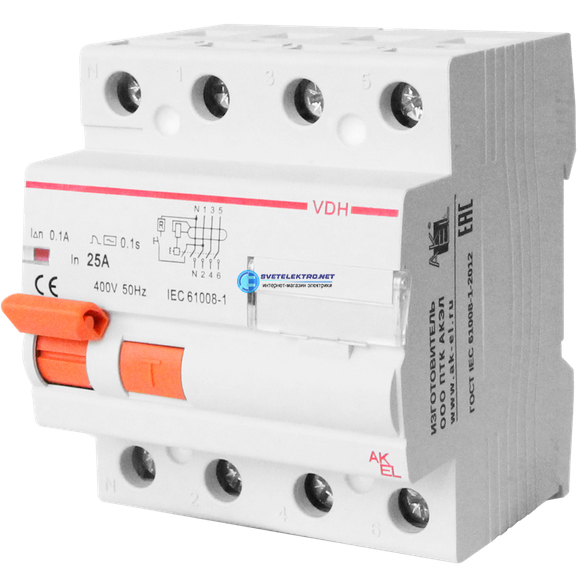 Устройство защитного отключения УЗО-VDH-4P-100A-100мА-Тип AC 4P/100A/AC/380VAC/100мА/10кА, код 400685, производитель АКЭЛ