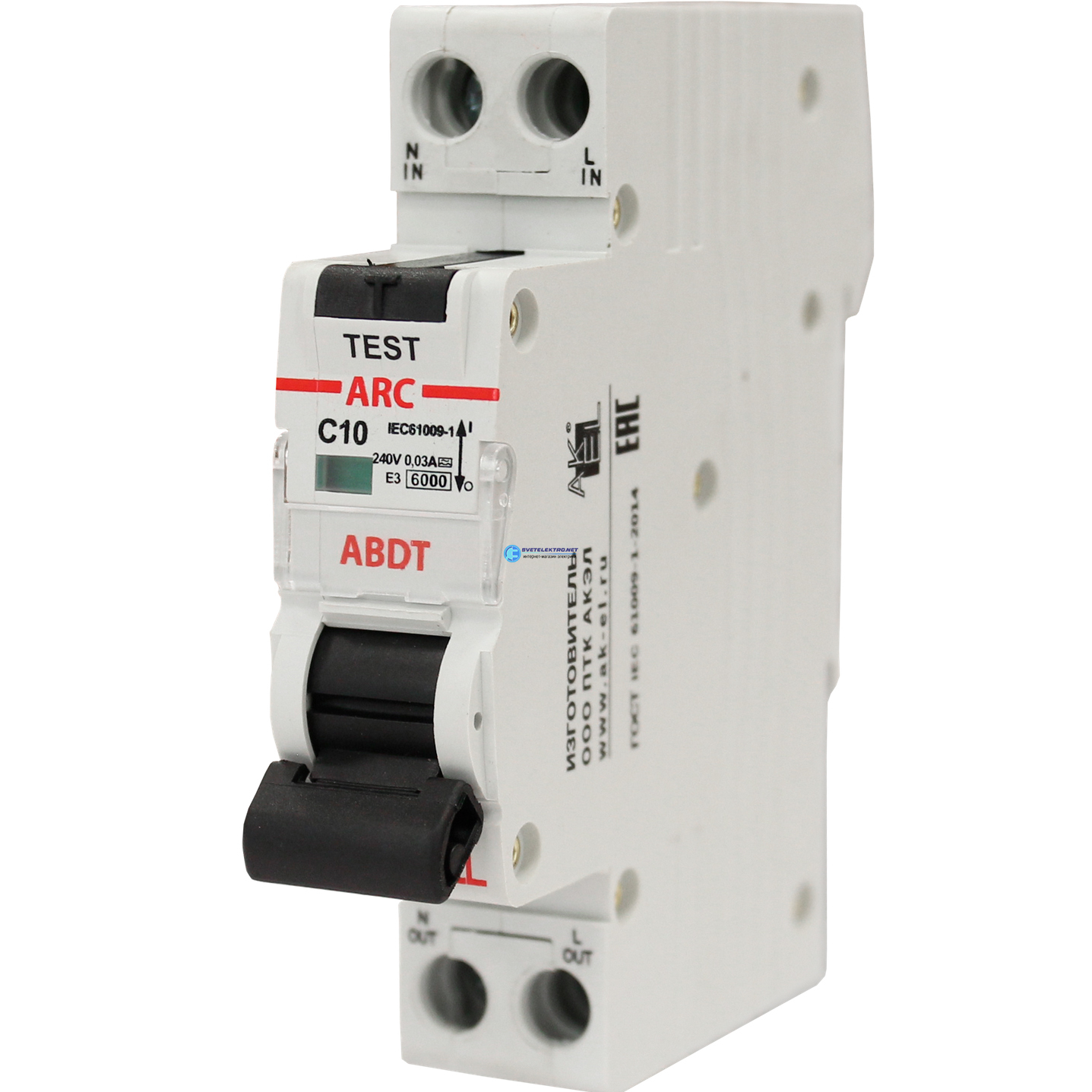 Выключатель дифференциальный автоматический АВДТ-ARC-1P+N-C10-30mA-ТипAC 1P+N/10A/C/AC/230VAC/30mA/6kA, код 400915, производитель АКЭЛ