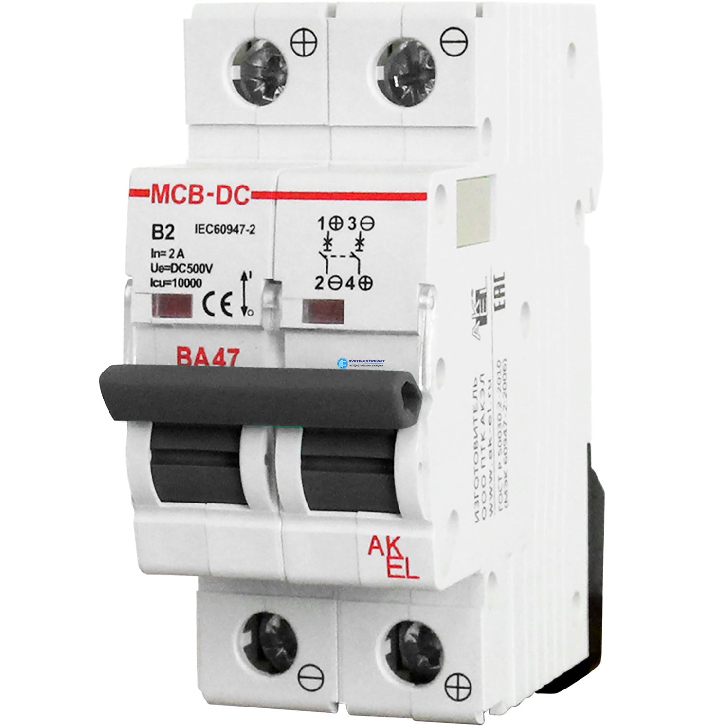 Выключатель автоматический ВА47-MCB-N-2P-C10-DC 2P/10A/С/500VDC/6кА, код 401544, производитель АКЭЛ