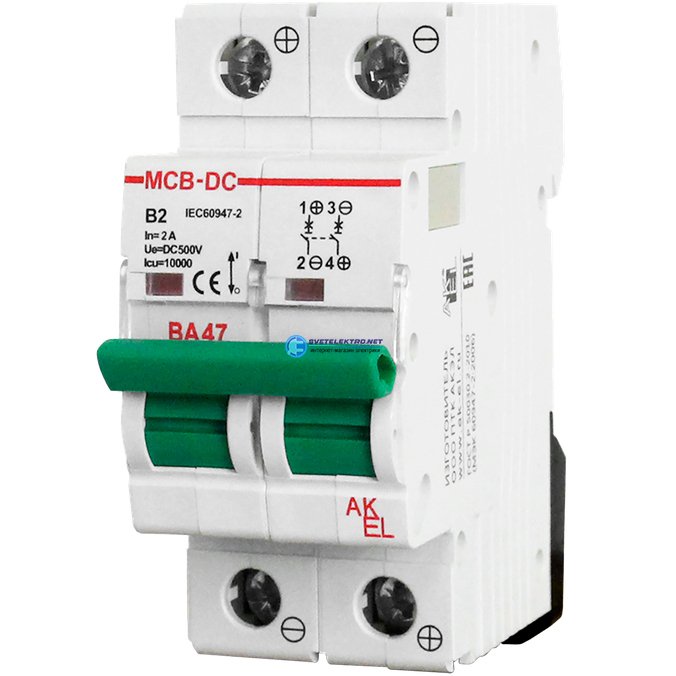 Выключатель автоматический ВА47-MCB-H-2P-C2-DC 2п 2A C 500VDC 10кА, код 402540, производитель АКЭЛ