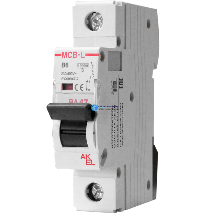 Выключатель автоматический ВА47-MCB-L-1P-B6-AC 1P/6A/B/10кА/230VAC/10кА/400VAC, код 404004, производитель АКЭЛ