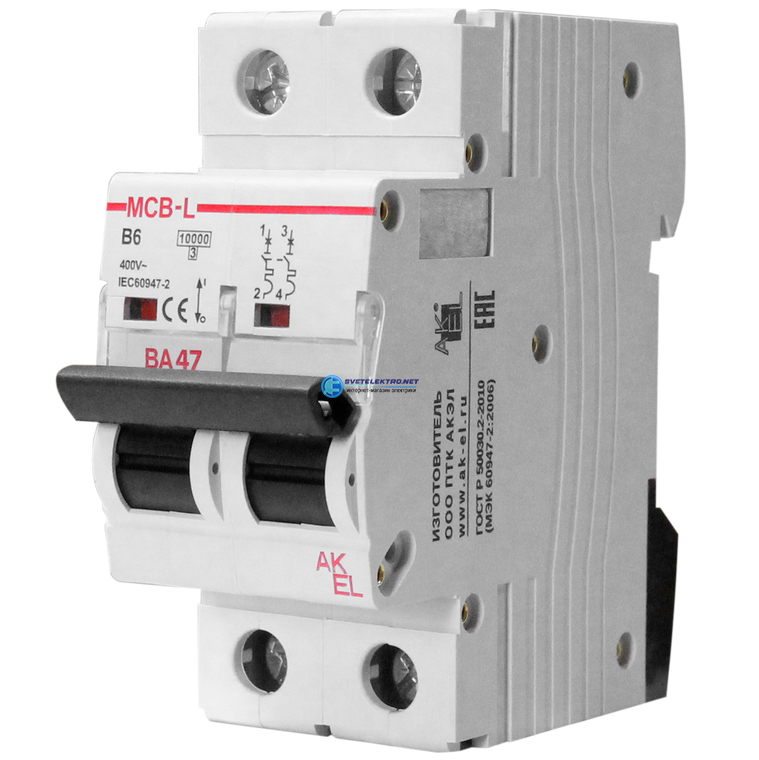 Выключатель автоматический ВА47-MCB-L-2P-B63-AC 2P/63A/B/10кА/230VAC/10кА/400VAC, код 404025, производитель АКЭЛ