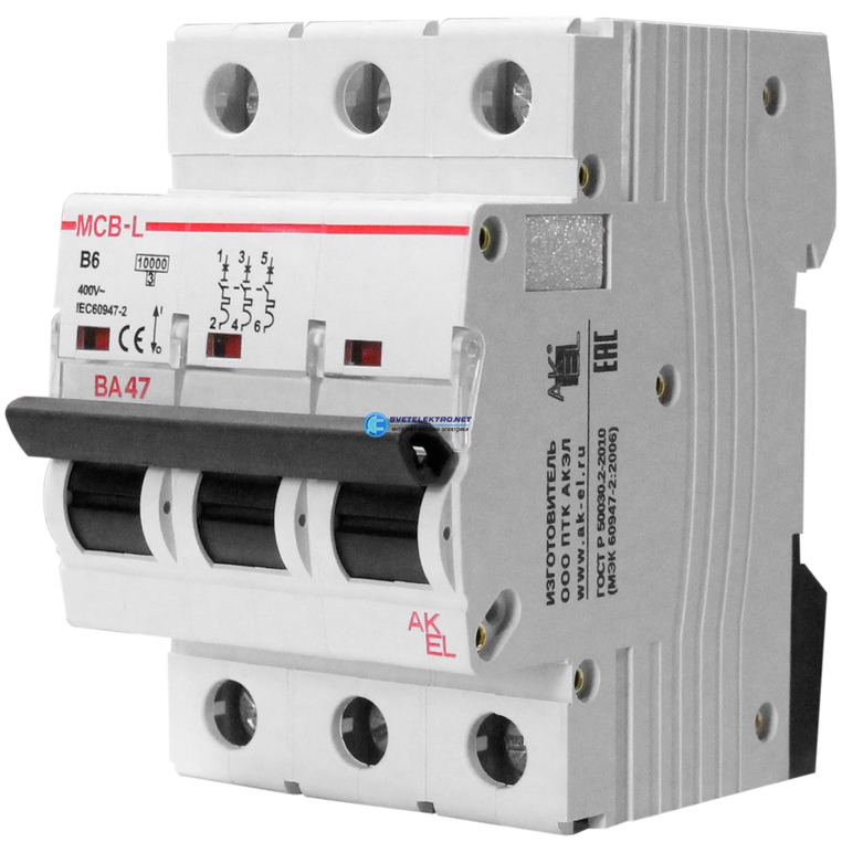Выключатель автоматический ВА47-MCB-L-3P-B25-AC 3P/25A/B/10кА/230VAC/10кА/400VAC, код 404034, производитель АКЭЛ
