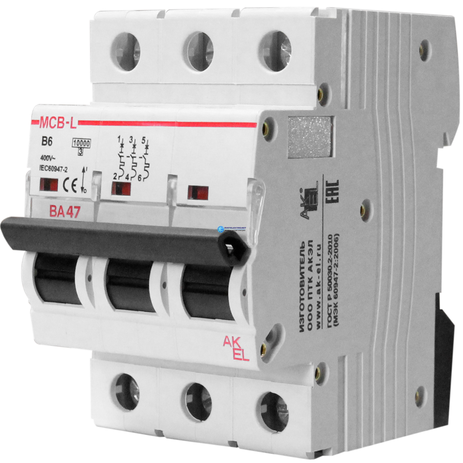 Выключатель автоматический ВА47-MCB-L-3P-B40-AC 3P/40A/B/10кА/230VAC/10кА/400VAC, код 404036, производитель АКЭЛ