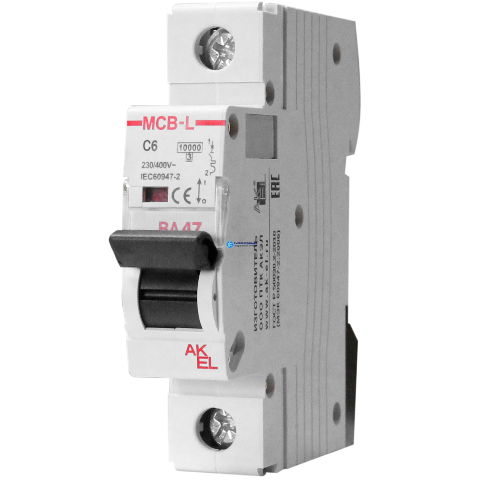Выключатель автоматический ВА47-MCB-L-1P-C6-AC 1P/6A/C/10кА/230VAC/10кА/400VAC, код 404056, производитель АКЭЛ