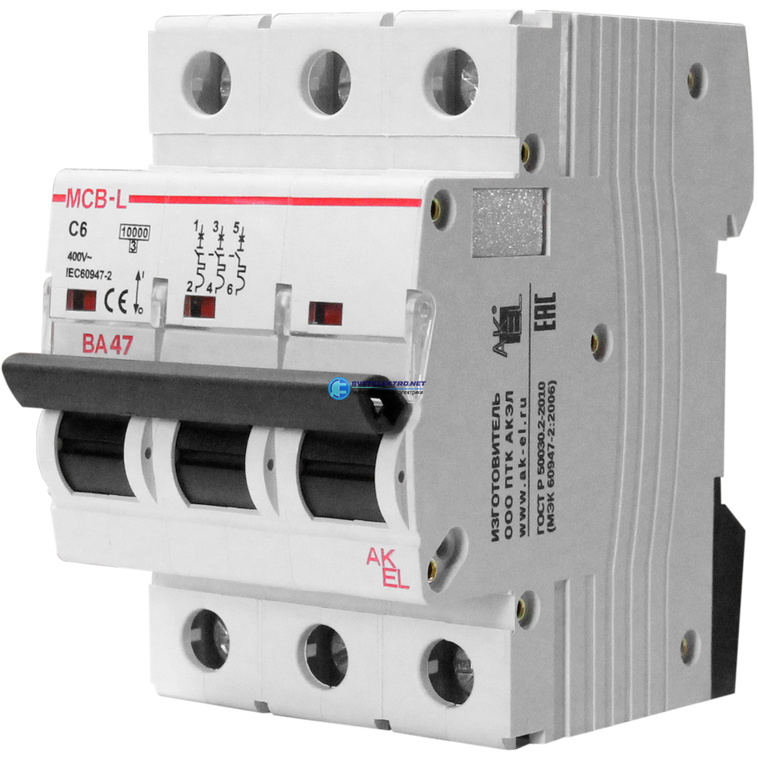 Выключатель автоматический ВА47-MCB-L-3P-C3-AC 3P/3A/C/10кА/230VAC/10кА/400VAC, код 404080, производитель АКЭЛ