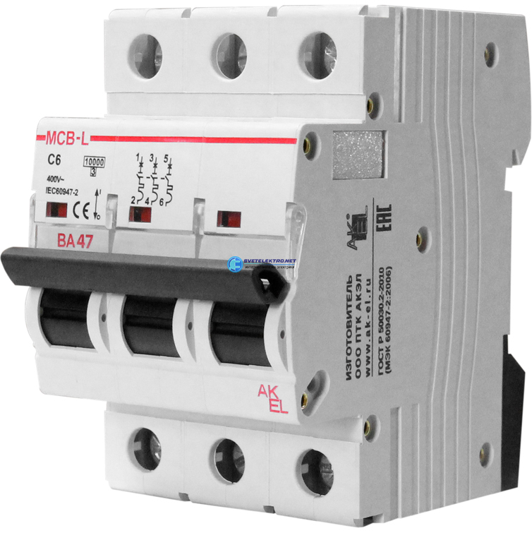 Выключатель автоматический ВА47-MCB-L-3P-C63-AC 3п 63A C 10кА 230VAC 10кА 400VAC, код 404090, производитель АКЭЛ