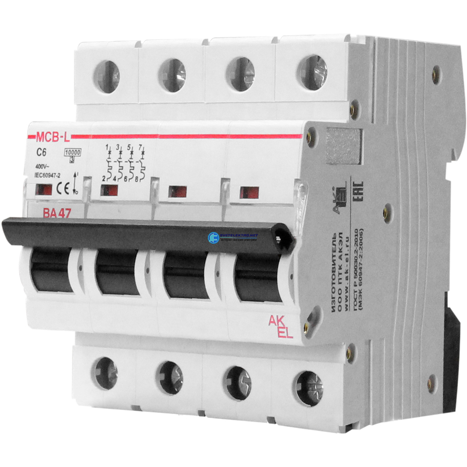 Выключатель автоматический ВА47-MCB-L-4P-C6-AC 4P/6A/C/10кА/230VAC/10кА/400VAC, код 404095, производитель АКЭЛ