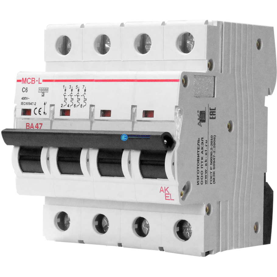 Выключатель автоматический ВА47-MCB-L-4P-C63-AC 4P/63A/C/10кА/230VAC/10кА/400VAC, код 404103, производитель АКЭЛ