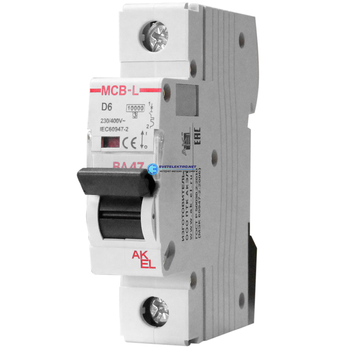 Выключатель автоматический ВА47-MCB-L-1P-D6-AC 1P/6A/D/10кА/230VAC/10кА/400VAC, код 404108, производитель АКЭЛ
