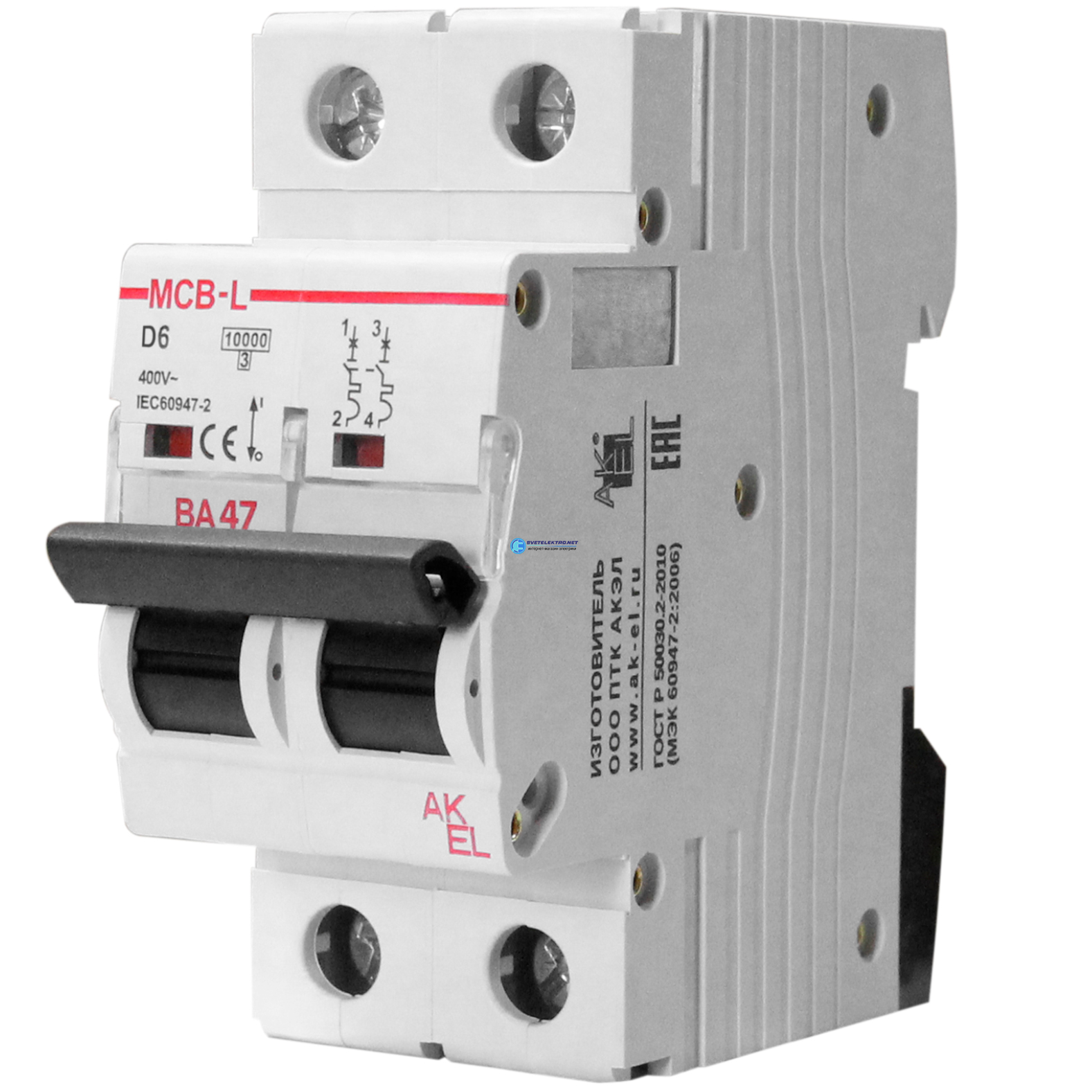 Выключатель автоматический ВА47-MCB-L-2P-D4-AC 2P/4A/D/10кА/230VAC/10кА/400VAC, код 404120, производитель АКЭЛ