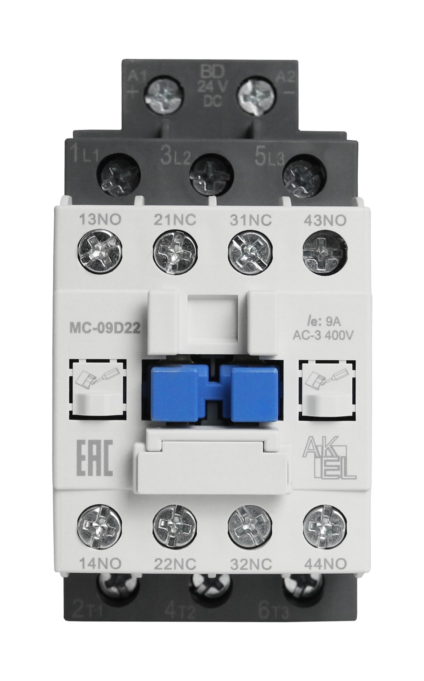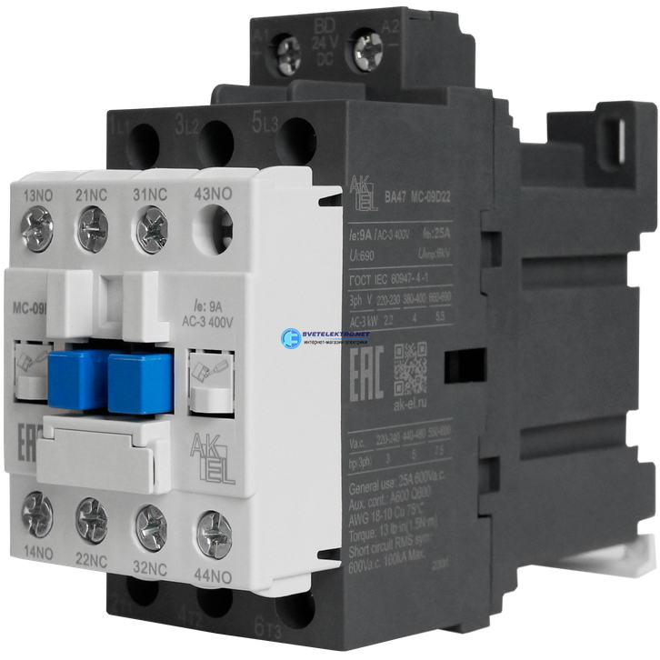 Контактор магнитный BA47 MC-09D22BD 3P 2NO+2NC/9A/24VDC, код 418703, производитель АКЭЛ