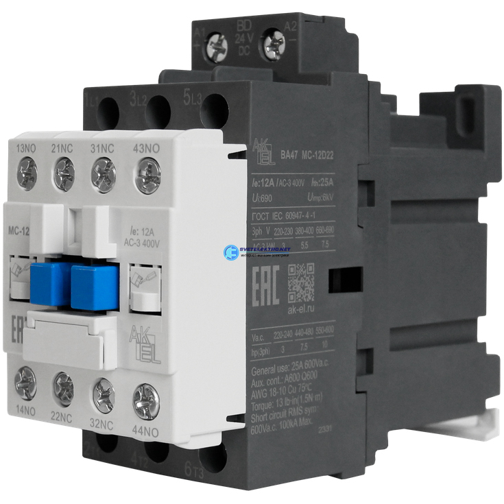 Контактор магнитный BA47 MC-12D22BD 3P 2NO+2NC/12A/24VDC, код 418707, производитель АКЭЛ