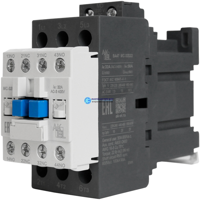 Контактор магнитный BA47 MC-32D22MD 3P 2NO+2NC/32A/220VDC, код 418718, производитель АКЭЛ